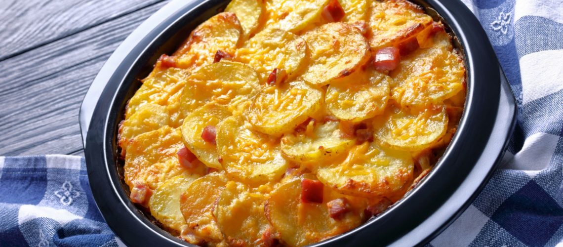 Melt margarine in saucepan. Add flour and mix well. Add salt and pepper. Then add 3 more cups of milk to make sauce. Boil 2 minutes. Put layer of potatoes in casserole dish, then add a layer of ham and onions. Spread with half of the sauce. Repeat layers and sauce. Cover and bake 1 hour at 350°. Uncover and bake 15 or more minutes until done.